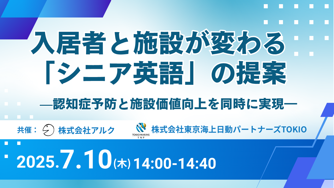 高齢化が進む日本社会において、認知症予防や心の健康維持は入居者一人ひとりの課題であると同時に、介護・福祉・健康関連の事業者にとっても重要なテーマとなっています。本セミナーでは、英語教育について長年の歴史があるアルクが提案する「シニア英語」プログラムを通じて、入居者の認知症予防、施設全体のブランディング強化、日本人職員への英語、外国籍職員への日本語といった語学教育支援など、複合的な価値を提供する取り組みをご紹介します。「健康」「学び」「つながり」をキーワードに、介護・福祉施設や関連企業、そしてシニア層にとって意味のある新しい取り組みを、ぜひご一緒に始めてみませんか。