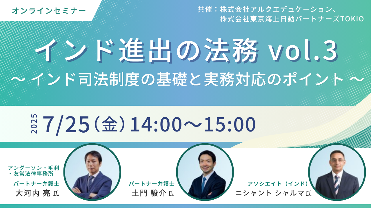 本セミナーでは、インドの司法制度の概要、訴訟制度の仕組み、そして企業が訴訟の当事者となった場合の具体的な対応について、インド案件の豊富な経験を有する大河内弁護士・土門弁護士がわかりやすく解説します。
