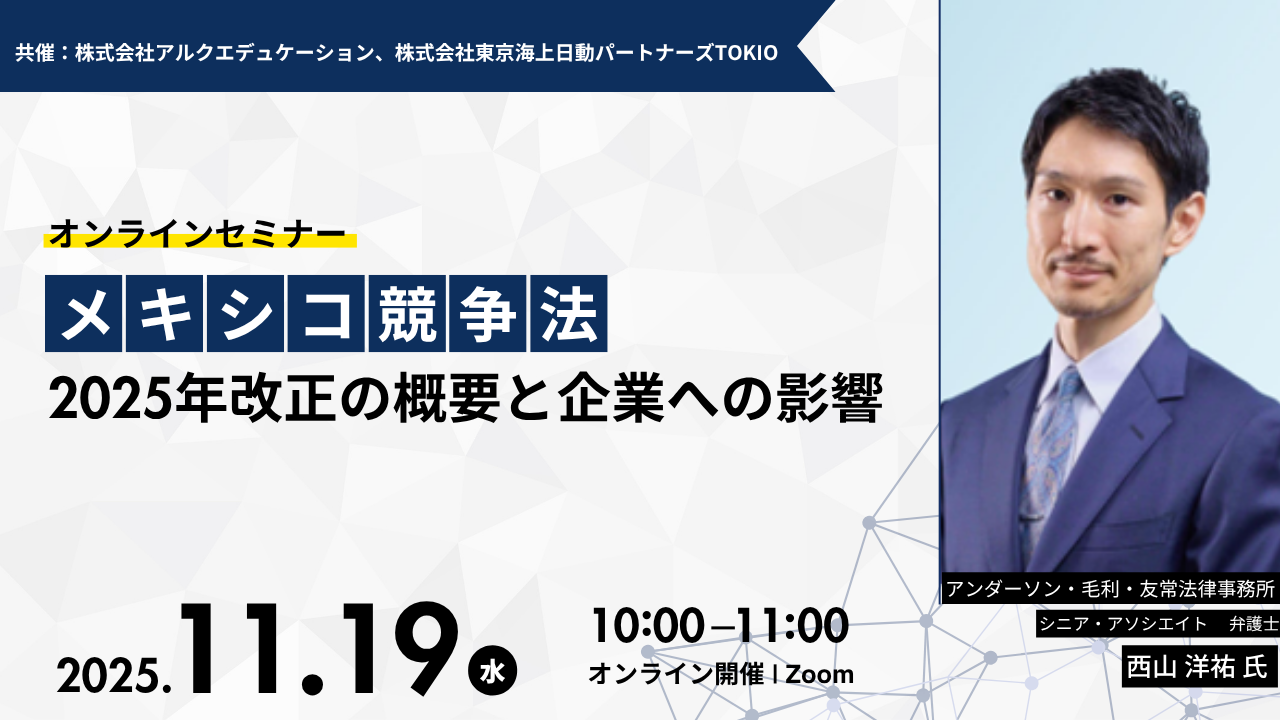 本セミナーでは、改正の概要を説明するとともに、企業が留意すべきポイントを実務的な観点から解説いたします。既にメキシコで事業を営んでいる、又は今後メキシコへの投資を検討している企業にとっては、競争法遵守体制の見直しが急務となるため、CNAによる新たな監督体制やリニエンシー制度の変更点など、実務対応に直結する情報をお届けします。